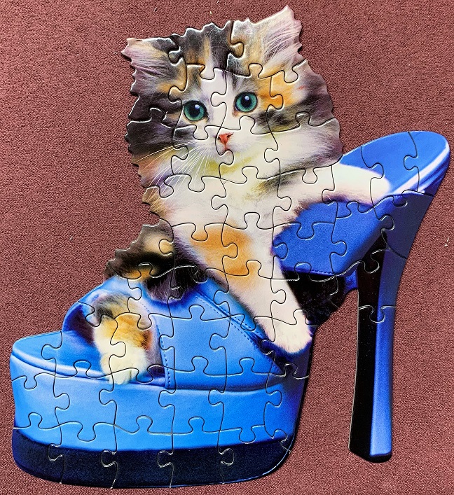 Ok, I know we just finished the freak shakes puzzles a few days ago, and I apologize for another set of these puzzles/posts so quickly – but this blog is about the puzzles I assemble, and this is the order in which they were completed. But, if you enjoyed my posts of Selfies and Unicorns last year, you may enjoy these too. These fabulous shoes and purses with kittens inside them are just begging for backstories, aren’t they?