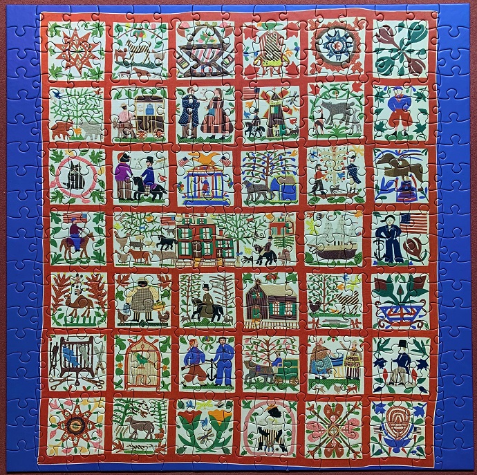 Long time readers know I love a puzzle with quilts, and this is an image of just one very old quilt – and a busy one at that. It was pretty difficult for only 300 pieces, and for some reason I decided to make it harder on myself by putting the box away and working without an image. Wow.