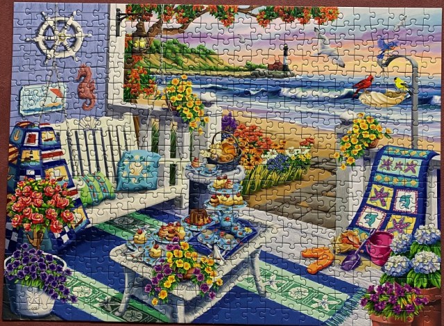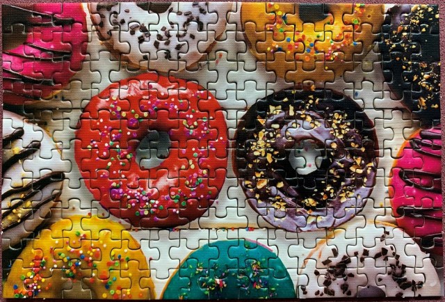 Within a few moments of starting to assemble the edge the tightness of the fit showed up – 10 pieces put together and the straight edge was curling up because of it. I expected the fuzzy image, so that wasn’t a surprise. Even with all these problems, because it was a collage with an image that was pleasing I still enjoyed myself and finished this puzzle pretty quickly.