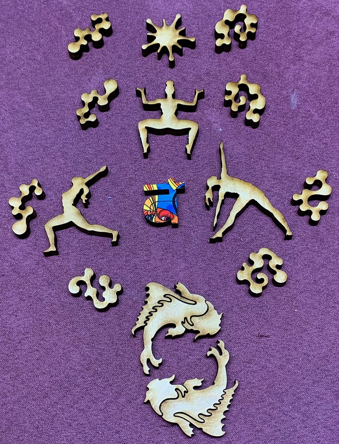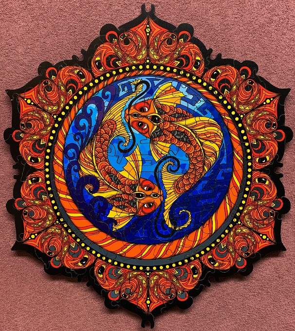 Here we have three yoga poses, the symbol for this chakra, and lots of other baubles and doohickeys. It was a more complicated assembly than it seems if you only see the front of the puzzle. You can also see some symmetrical shapes that tell you there’s another image that you can make with the pieces. Before you scroll down can you find all the pieces to make two fish? 🐠🐠