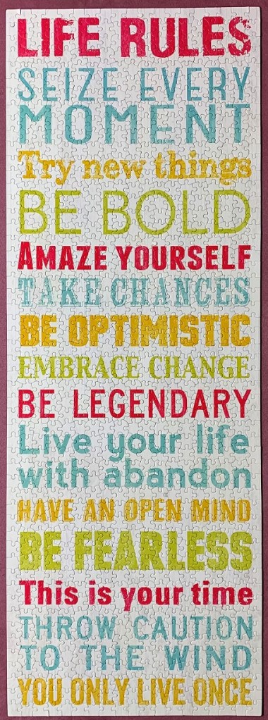 I always love having words to assemble in a puzzle, but when the words are basically the whole image – or even when they’re just very large – it can become quite difficult. All the pieces are basically just the background color, and the color of the letter. And there were only four colors in this image, each color was used multiple times for their own set of words. It was quite the challenge.
