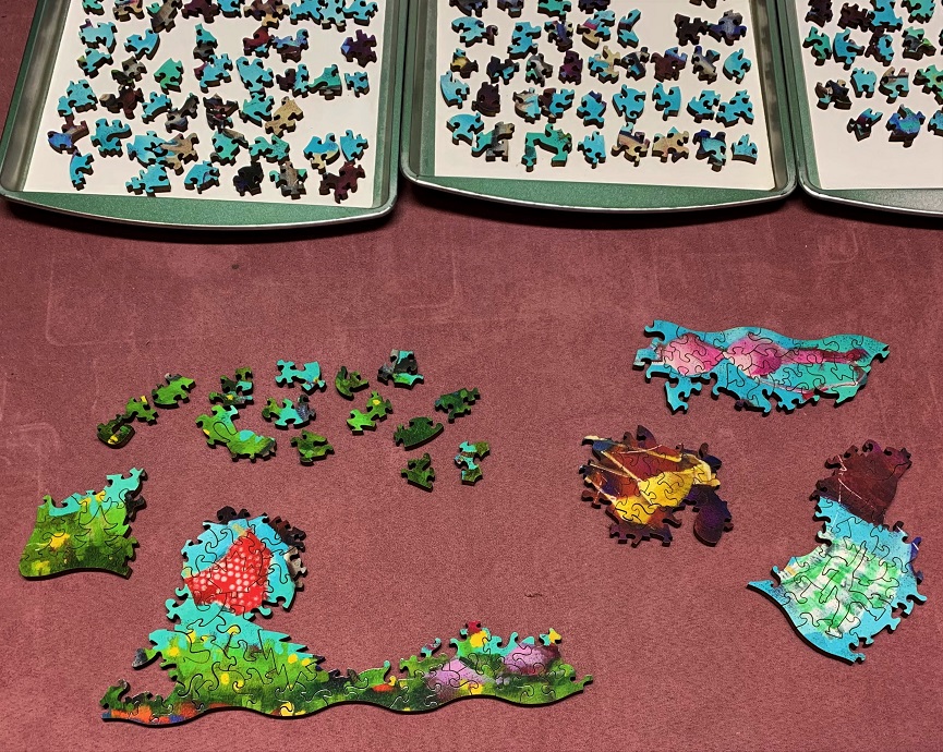 Mom used a big sheet of white board paneling, cut down to a manageable size, that my dad bought from the hardware store. When she was working on a puzzle she’d put it on top of her big table in the office (it had plenty of room for us to sit side by side and puzzle together when I visited), and when she needed the table for other things she’d just pick up the board and set it on the day bed. She also worked late into the night on puzzles, especially if we hadn’t finished a puzzle on one of our Friday visit days. She’d text me a picture of the finished image and say something like “worked on this one till 3 am, but we finally got it done!”.