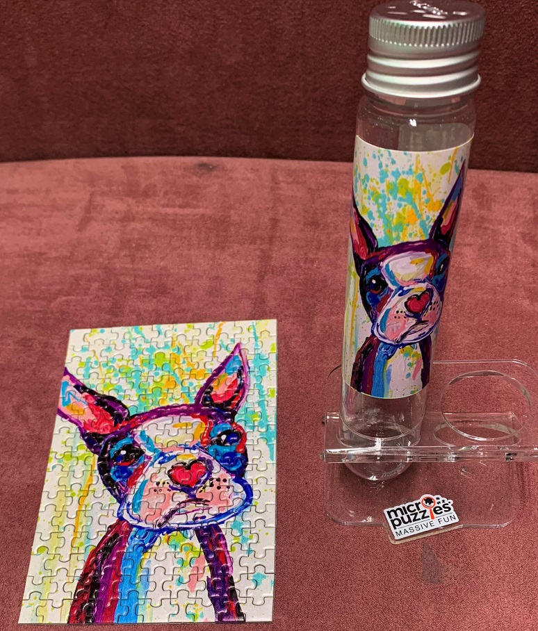Heart Nosed Ned seems like a puzzle made especially for me. Not only does it look like our beloved Buddy, who left us about a year and a half ago, but it was painted by a young man with autism; if you’re a long-time reader you may remember that both of my sons have autism. Once I saw this beauty on the MicroPuzzles website and read about it’s artist there was no way it wasn’t going to find it’s way home to me. It’s my perfect puzzle!