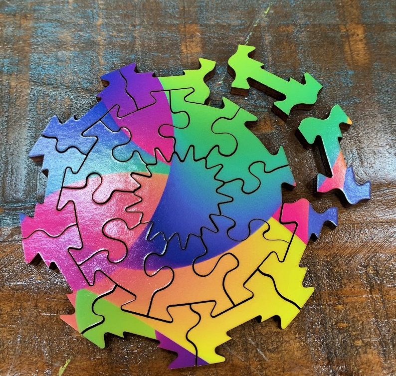 The image was beautiful, but it was the abstract pieces and how the puzzle was assembled from the center outward that had both of us so enamored with it. While we were working on it I was telling him about another puzzle by the same artist with a somewhat similar but more complex shape on the Artifact website, and how the other puzzle was in my cart first while I was shopping but I switched it out for this one because the first one looked a bit more difficult.