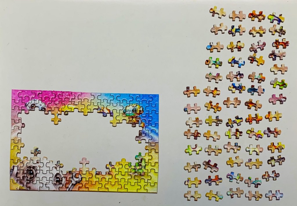 Despite the bright colors around the edges, the rest of the image seems so similar on the pieces that it’s difficult to put in even a piece or two under the less than adequate lighting in there. It definitely shows that I need to ask hubby if we can do something about that; otherwise there will always be images that need to be finished under the better lights in the puzzle room.