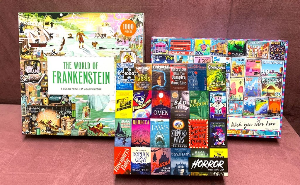 Anyway, now that these three puzzles are sitting on my board, my fickle menopausal brain (currently being slowly boiled from the inside by hot flashes) has decided that I’m going to assemble the horror books collage. I haven’t started it yet, but I’m very much looking forward to it!
