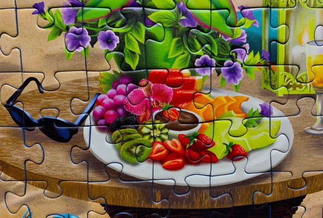 The large piece Ravensburger puzzles are quite fun for me, there’s a special something about the larger pieces that I find wonderful to work with. And the larger finished puzzle makes you feel as if you’ve accomplished something impressive when you’re done; it’s about the size of a typical 1000 piece puzzle.