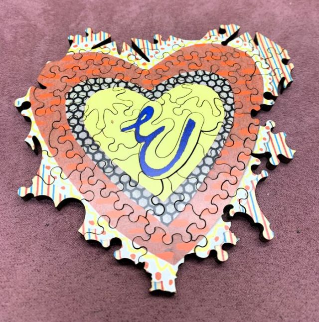 Honestly, it’s been the wooden puzzles that I’ve really been missing. Don’t worry, the love for cardboard puzzles is still here, but right now the one that’s been calling to me is this gorgeous puzzle called Love Connection. It’s patchwork-y, so it reminds me of quilts, which you know I love; and it’s designed so you can work on each heart containing a letter if that’s how you want to go about it (almost like a collage, which is another of my favorite puzzle images).