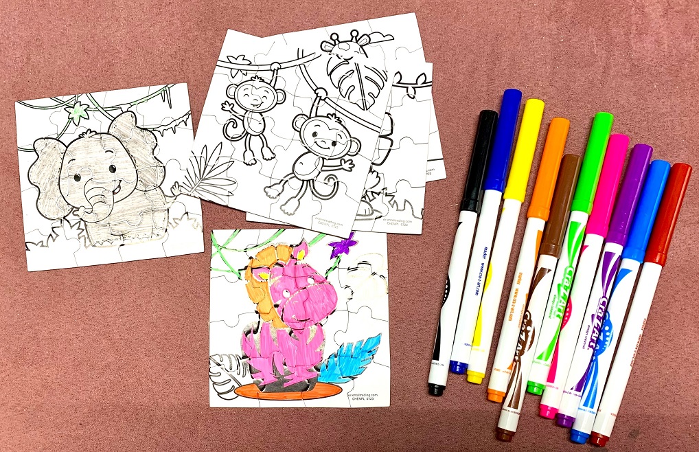 I haven’t started actually assembling any of these puzzles yet; I’ve decided to color them all first. My daughter went out to dinner and somehow got them to give her the puzzles they have for kids to play with at the restaurant. Love her!