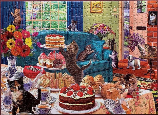 This was quite a difficult puzzle for only having 208 pieces, and it took all four of us much longer to finish it than I’d thought it would. But it’s a beautiful image and a wonderful puzzle. Highly recommended!