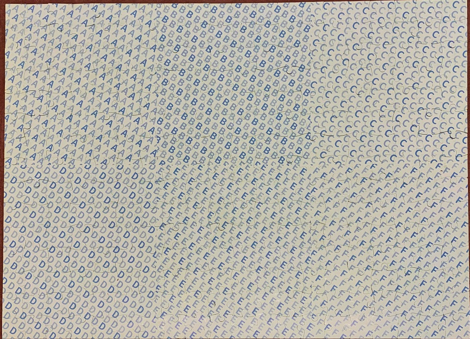 Wanting to get a sense of it I did sort out all the “A” pieces and then put them together. It’s fine if it helps you enjoy your puzzles, but it really isn’t for me. I put together the rest of the puzzle as I normally do without regard to the letters on the back. (It could be helpful though, especially with this brand and all the false fits that this puzzle has to offer.)