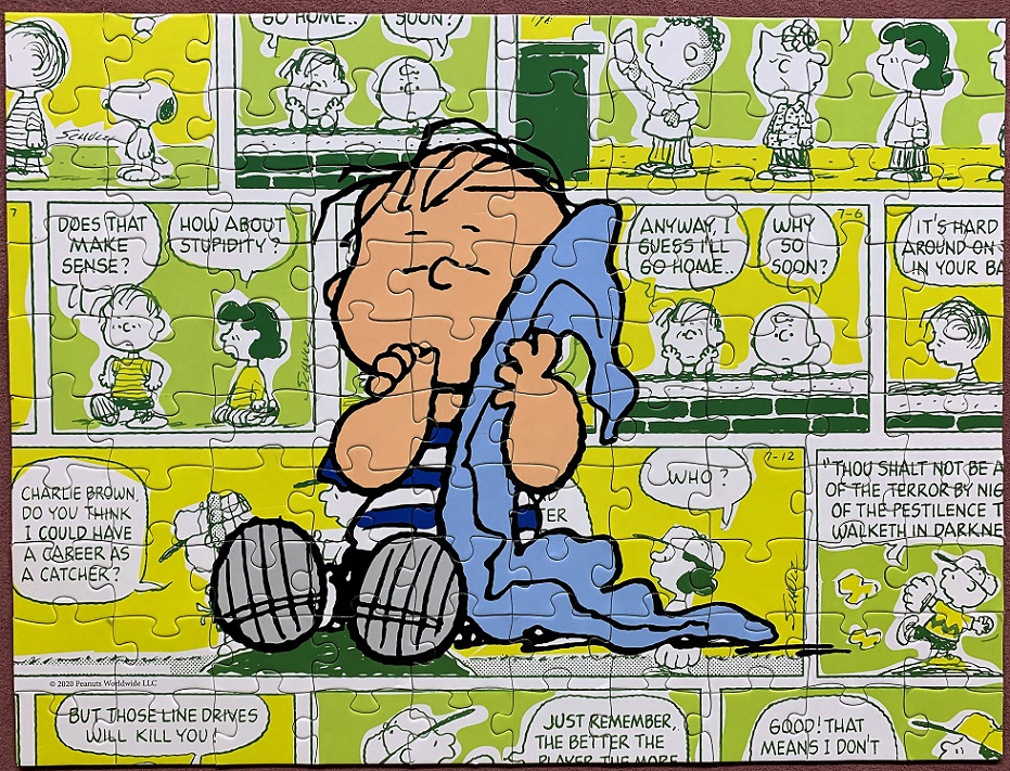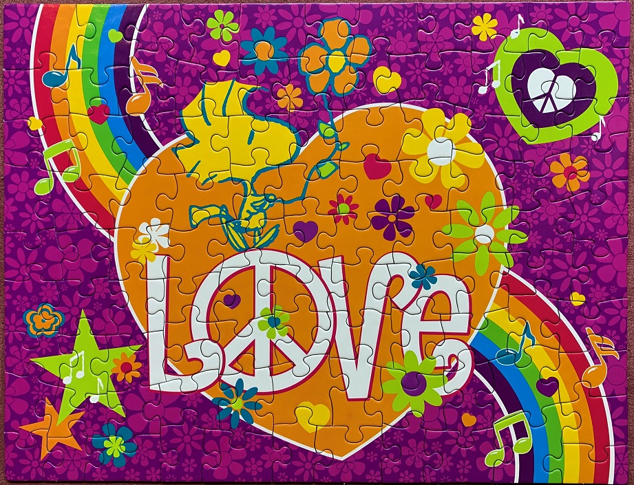 This cute little puzzle was at the cabin, and you know I can’t resist a kids puzzle (even if it is a Ceaco). Unfortunately one of the pieces had obviously escaped, and it’s in a pretty obvious place too; poor Snoopy is missing a section of his doghouse. Nevertheless, we had fun putting it together – and hubby helped with this one too!