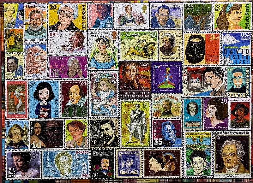 Such a bright, colorful, entertaining puzzle – where do I begin? We all know how much collage puzzles make me happy, and this one was no different. The piece shape is quite evident in the finished image, but it doesn’t take away from how much fun I had putting it together. In addition to their many images with book covers, Re-marks has quite a few of these stamp collages as well – I’ve not been disappointed with any of them. 😁