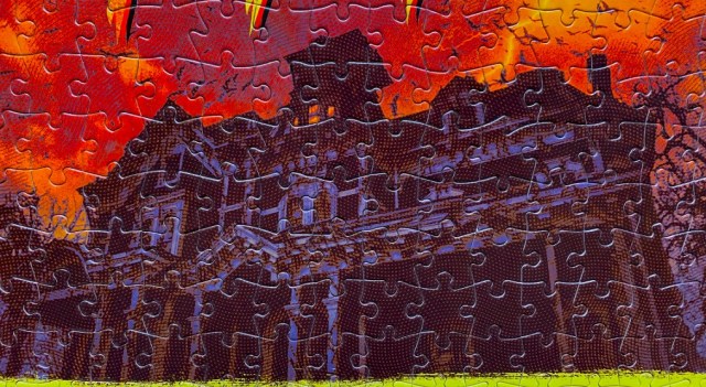 I started with the kids, obviously. The faces were the easiest to pick out, and their clothing all had different textures to them that weren’t too hard to find. Then I put together those large letters, which other than the house below was the most difficult part of the entire image.